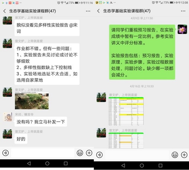 由于高校学生来源地域广、人群聚集密度大、社会关注度高的特点。“生态学基础实验”课程组明确线上教学是特殊时期的特殊做法,利用各种平台,做到“停课不停学、学习不延期”。“生态学基础实验”是环境科学专业本科生必修课,2018级43名同学上课。疫情期间由于部分在线教学平台访问量剧增,表现明显的不稳定性,我们利用最基本的通讯方式QQ和微信开展实验教学,确保在线实验教学顺利进行。曾文炉老师和马维琦老师同时结合“生态学基础实验”实际情况,针对实验课程内容、类型的特点,开展实验教学内容改革和教学模式与方法创新,及时修编实验教材内容,利用虚拟仿真、实用软件、PPT及实际操作相结合的方法做到停课不停学、学习不延期。利用QQ群按照课表安排的上课时间在线直播授课,在线指导实验教学、组织线上讨论、辅导答疑、作业批改。通过QQ群、微信群相互提醒、互动。